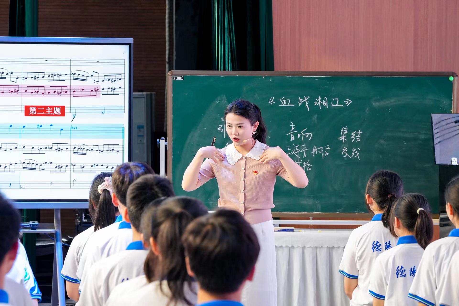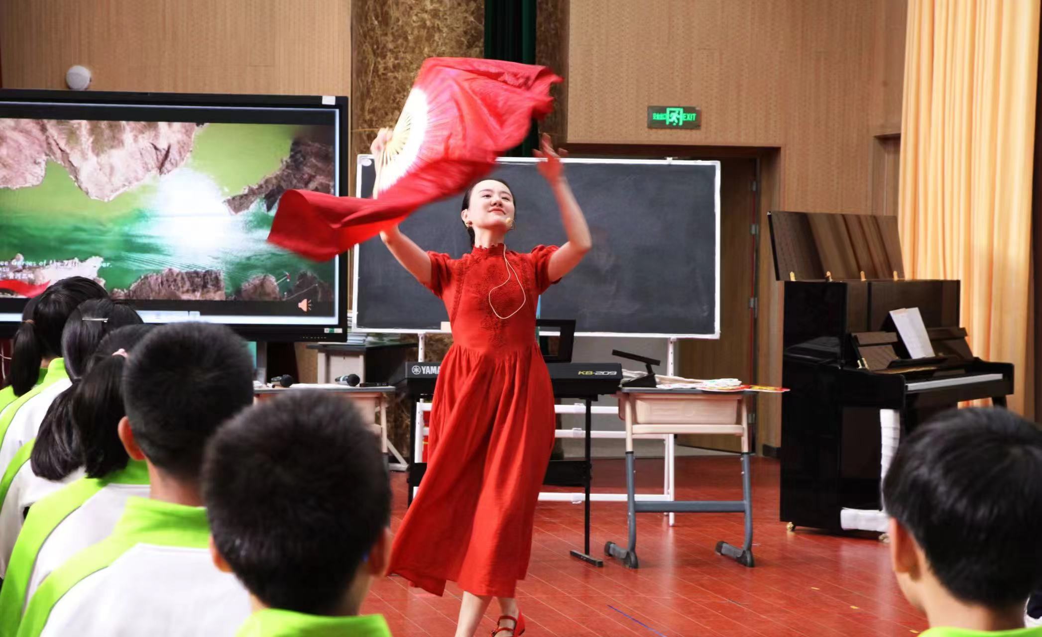 现任德阳市第二中学校初中音乐教师的唐诗琪,针对初中七年级学生的认知特点与变声期学习需求,设计了《中国》一课。她以扇子舞导入课堂,用肢体语言直观传递歌曲中的家国情怀;通过声势律动、手语互动,将四分之四拍与四分之三拍变换、倚音转调等抽象乐理知识,转化为可触摸、可感知的体验,帮助学生轻松突破学习难点。从用温暖声线演绎歌曲开篇,到以豪迈情绪唱响副歌,再到电子琴与中国鼓的创意搭配,整堂课将“学唱歌”升级为“懂音乐、抒真情”的过程,让美育真正走进学生心里。