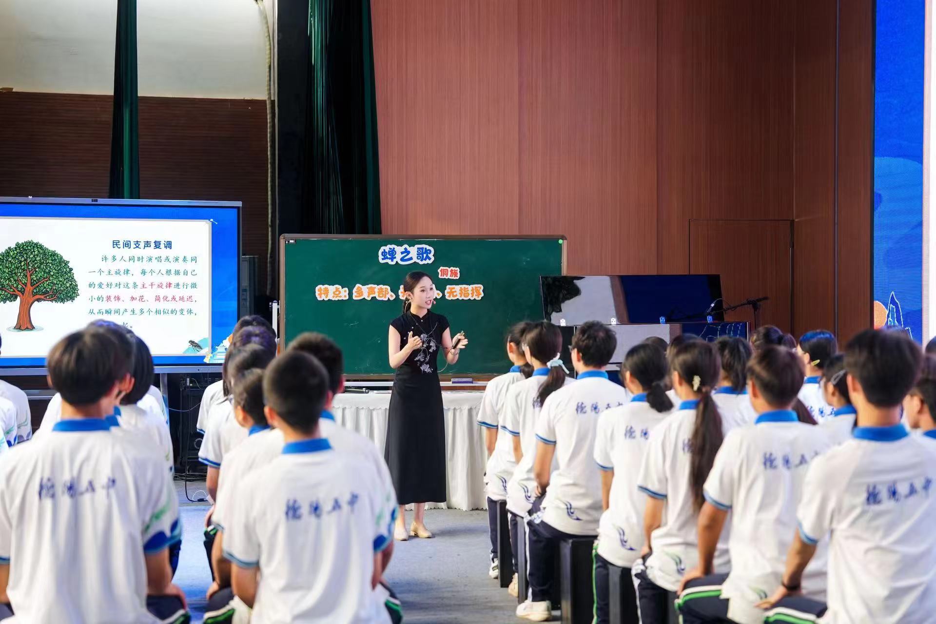 现任德阳市东汽八一中学高中音乐教师的王涵斯,则以侗族大歌《蝉之歌》一课传递民族音乐之美。课堂上,她摒弃说教式教学,带领学生“沉浸式”体验侗族文化:从模仿山林间的蝉鸣,到尝试无指挥、无伴奏的“模拟声部”演唱,学生们清澈的歌声与自然意境交融,让在场观摩者仿佛置身侗寨山林。这种以“体验感”为核心的教学设计,让学生感受多声部和谐之美的同时,深刻理解了民族音乐的独特魅力,实现了“以乐育人”的教学目标。