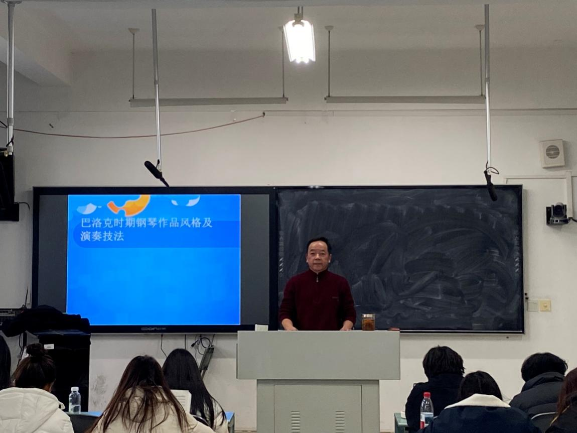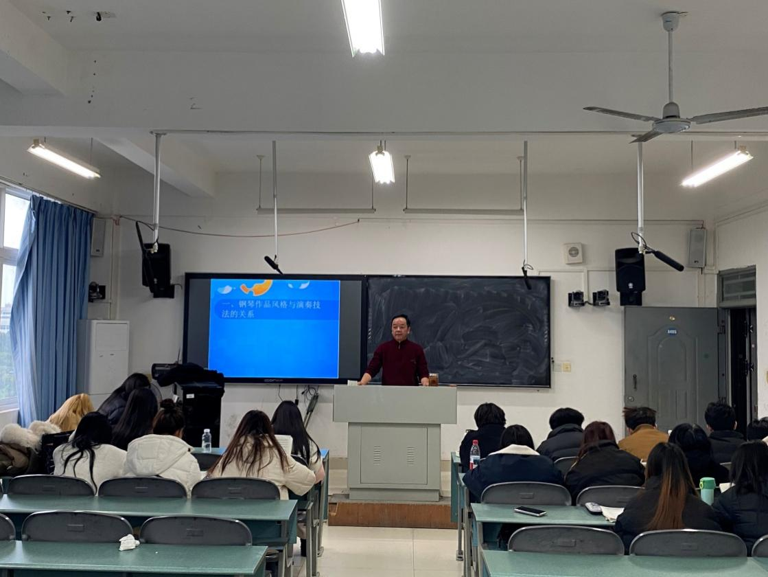 2025 年 11 月 6 日晚 19:00,音乐与舞蹈学院崔乾高副教授在音乐楼 A405 教室顺利举办《不同时期钢琴作品风格对演奏技法的影响》专题讲座。学院五十余名音乐专业学生莅临聆听,现场学术氛围浓厚。