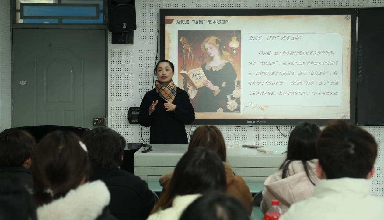 2025年11月19日12:30,我院声乐教研室蔡玲副教授在音乐楼A208教室,面向全院学生主讲《19世纪德奥艺术歌曲发展之旅》学术讲座,带领同学们沉浸式领略19世纪浪漫主义乐派艺术歌曲的独特艺术魅力。