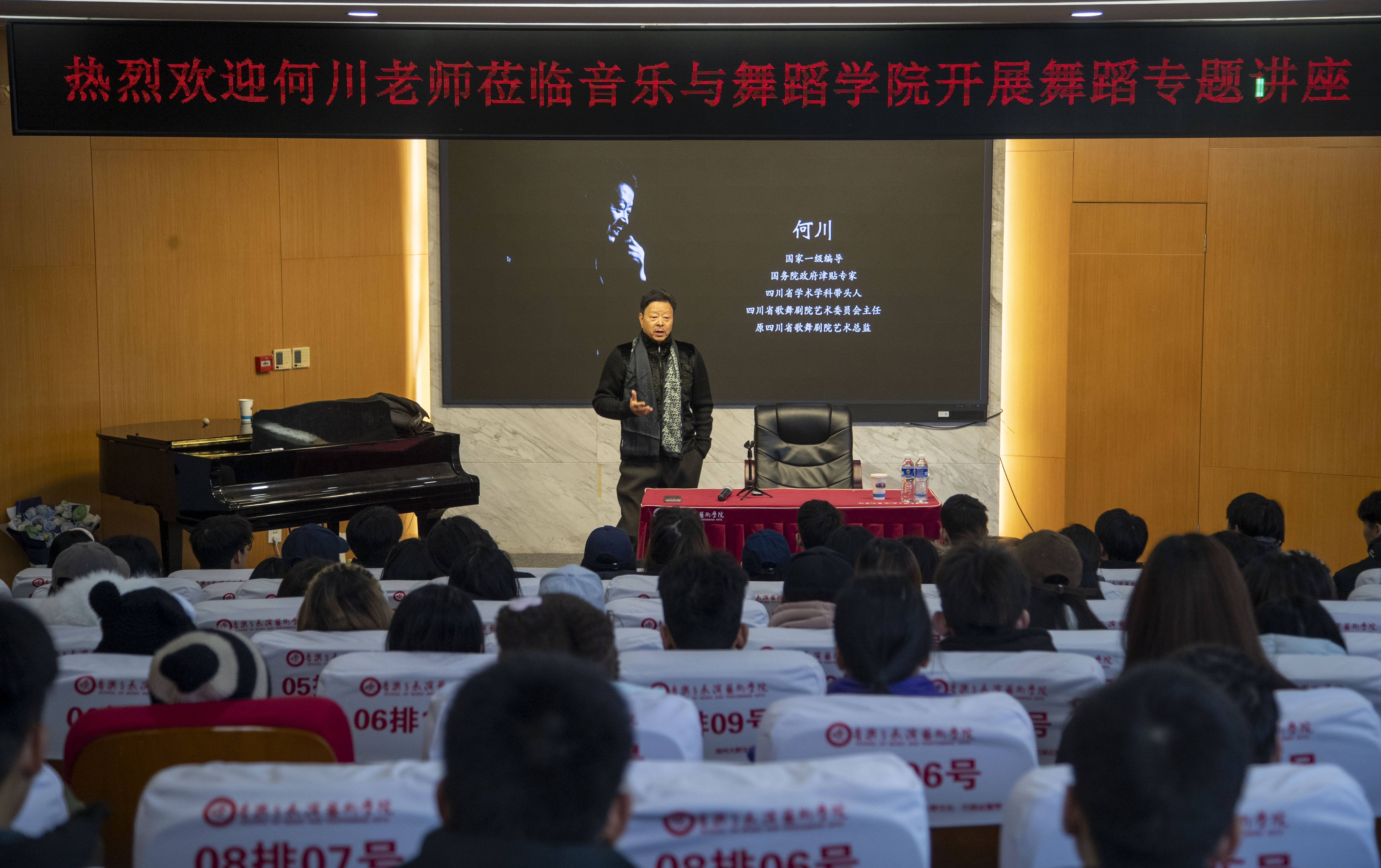 1月10日上午9:30,应绵阳师范学院音乐与舞蹈学院邀请,国家一级编导、国务院政府特殊津贴专家、四川省学术学科带头人、四川省歌舞剧院艺术委员会主任何川,在我院多功能厅为舞蹈表演专业师生作题为“身体的诗行,舞蹈赋予青春的浪漫与力量”的专题讲座。音乐与舞蹈学院院长王小明教授,舞蹈表演专业负责人杨雯,舞蹈教研室主任刘兵及舞蹈表演专业全体师生到场聆听。